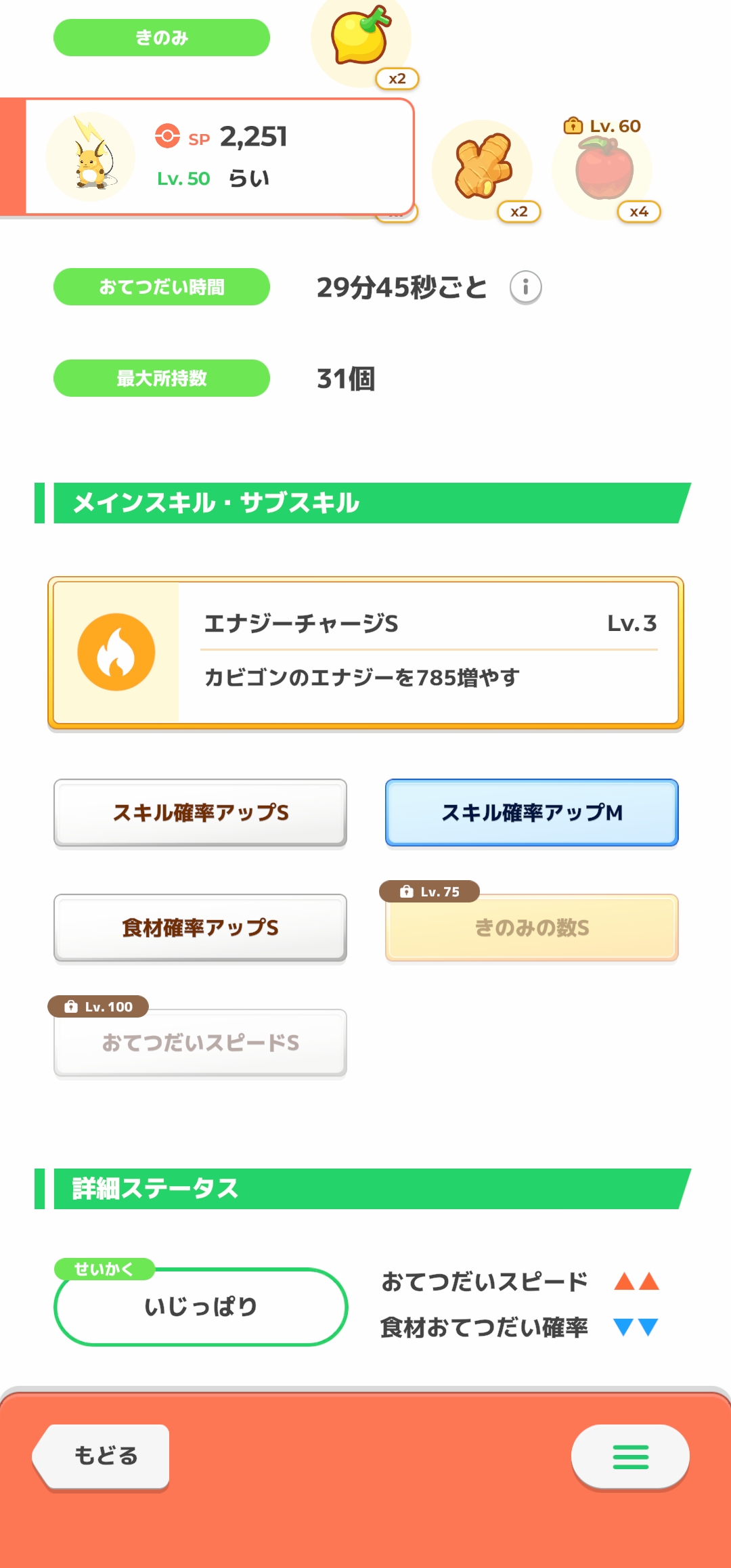 1回発動したらもう発動しない料理パワーアップと同じ仕組みならスキル確率ダウンの性格でさえ無ければいいかな