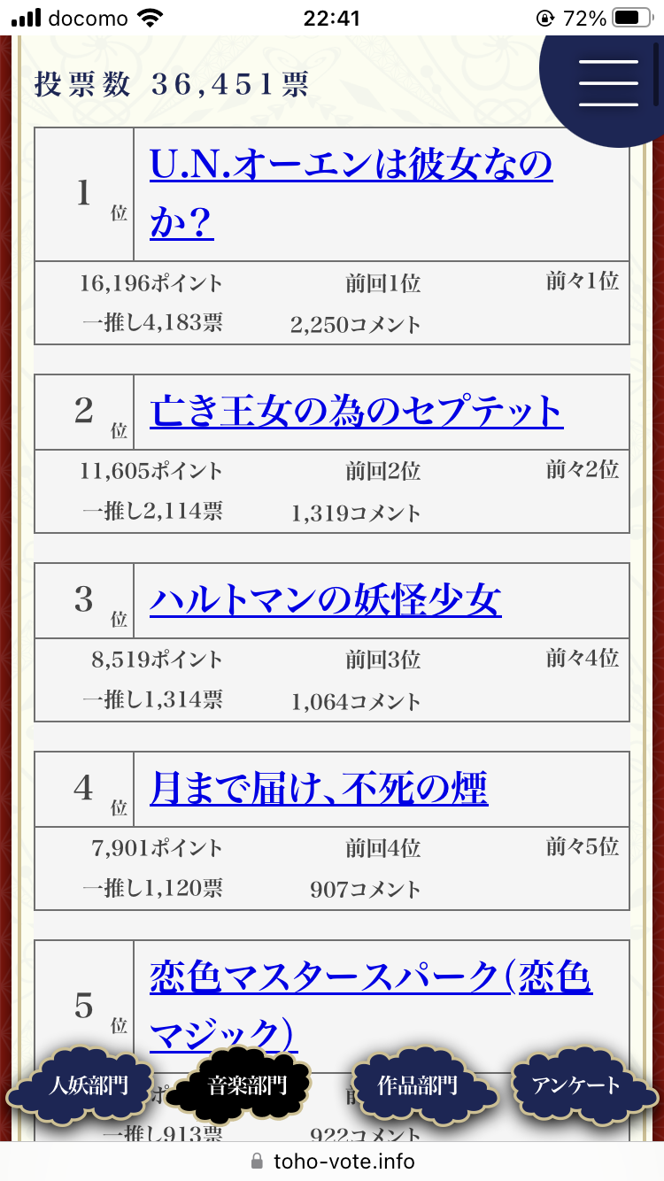 霊夢〜レミリアまでの7人は文字通り得票数段違いだから固定ファンがずっといるイメージなんだ