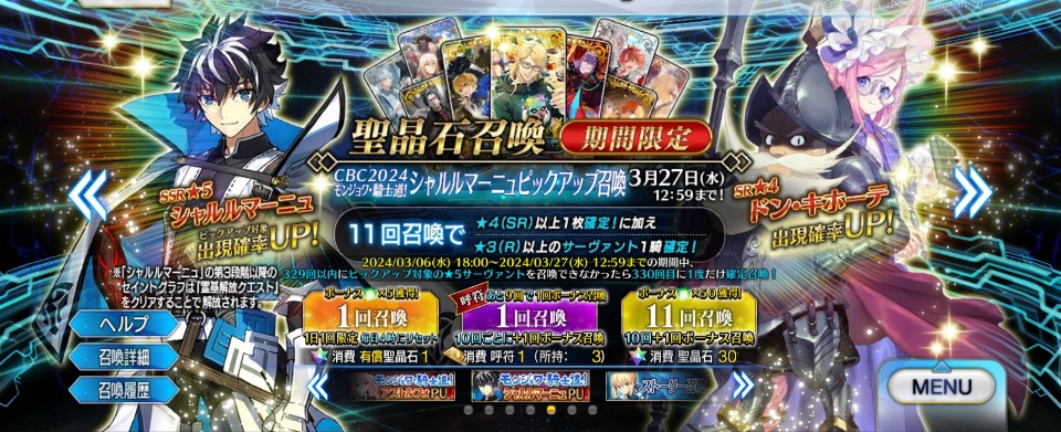 ガチャに関してですが、年に2度”福袋”と呼ばれる特別な催し(ガチャ)が開催されます。正月記念と7月末にあるFGOの周年記念の2回ですね。