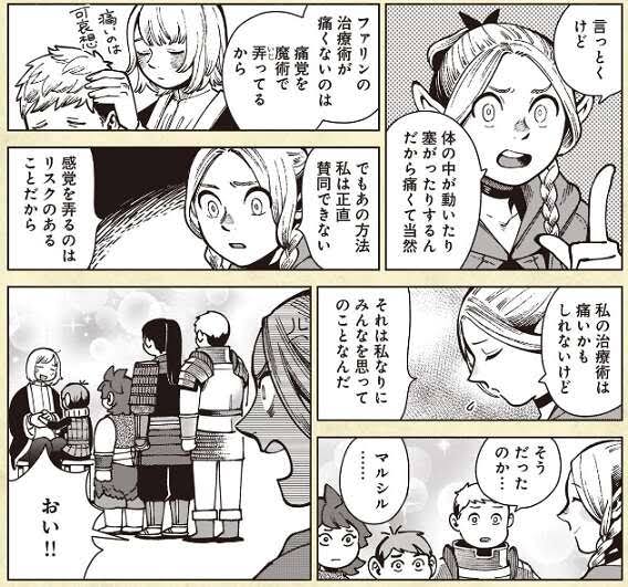 ファリンは(除霊の時もそうだけど)「できるだけ相手が苦しまないように」ってのが根本にあるけど、マルシルの「痛みがあって当然」の方が生き物としては正しい考え方かなと思う