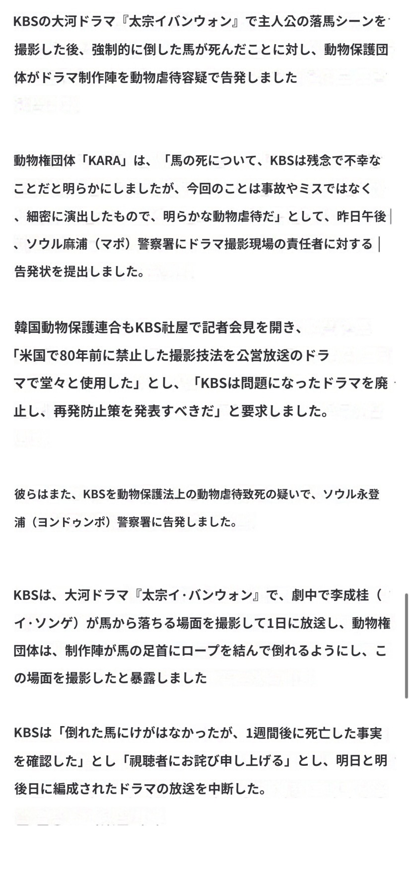 動物圏団体「カラ」は「馬の死についてKBSは残念で不幸なことだと明らかにしたが、今回の事は事故やミスではなく細かく演出したことで、明らかな動物虐待」とし、昨日午後、ソウル麻浦警察署にドラマ撮影場責任者に対する告発状を受け取りました。