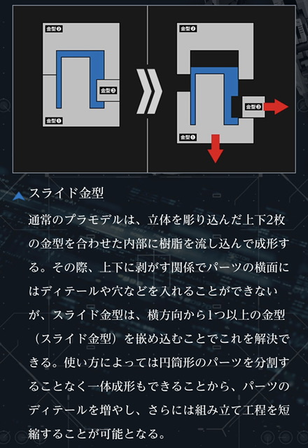 大っぴらに言うことが少ないだけでスライド金型はバンダイ以外でもわりと使われてるね
