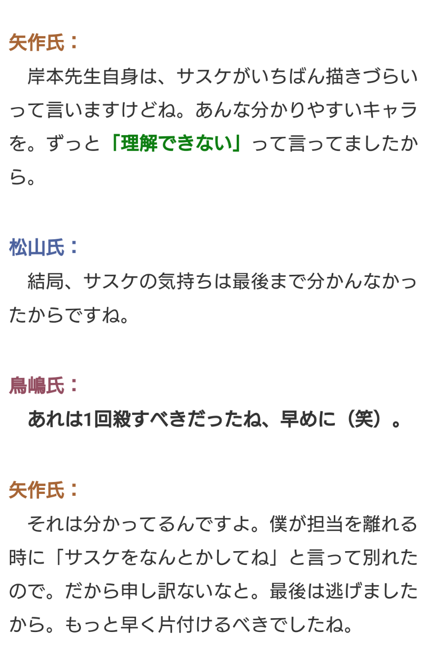 岸本先生が編集の言うことを謙虚に聞き続けるもサスケの件は戦って勝ち取ったというだけでは?
