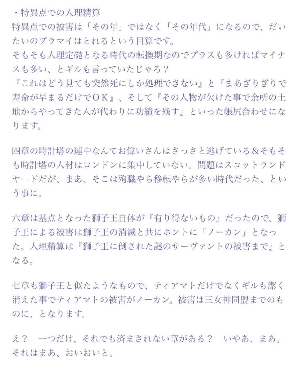 「ティアマトや女神ロンゴミアドのような神様レベルの存在による被害は例外事象としてなかったことにされるけど、それらに関わりのない被害は「何によって引き起こされたのか」を他のなにかに代えるだけで被害はそのまま残った状態になるけどあまりにも被害が甚大にならない限りは歴史が狂うような影響は出ませんよ(一個だけ神霊絡みじゃないのにあまりにも被害がでかくて歴史に影響が出てる特異点があります)」ってことだと思うんだ