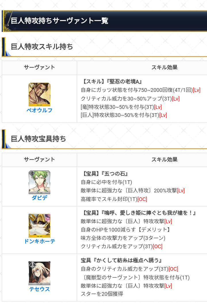 巨人はベオウルフ、ダビデ、テセウス、あと巨大特攻が藤野、アーサー、テスカトリポカだったかな?