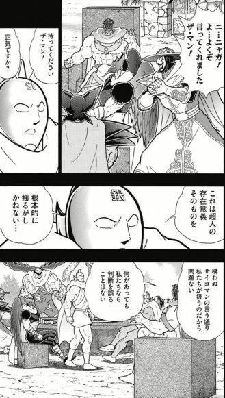よく考察として挙げられる説はカタブツ勢からのある程度の反発は織り込み済みで、使い方を議論したかった(特に銀と)んだろう。でも予想外に全員から反発(特に銀は完全否定)受けた挙句に師だけが強権発動してOKにしてしまうという最悪の展開になってしまった。これで対等な11人の同志ではなくなり、師も事実上ここが超人閻魔のスタート地点に