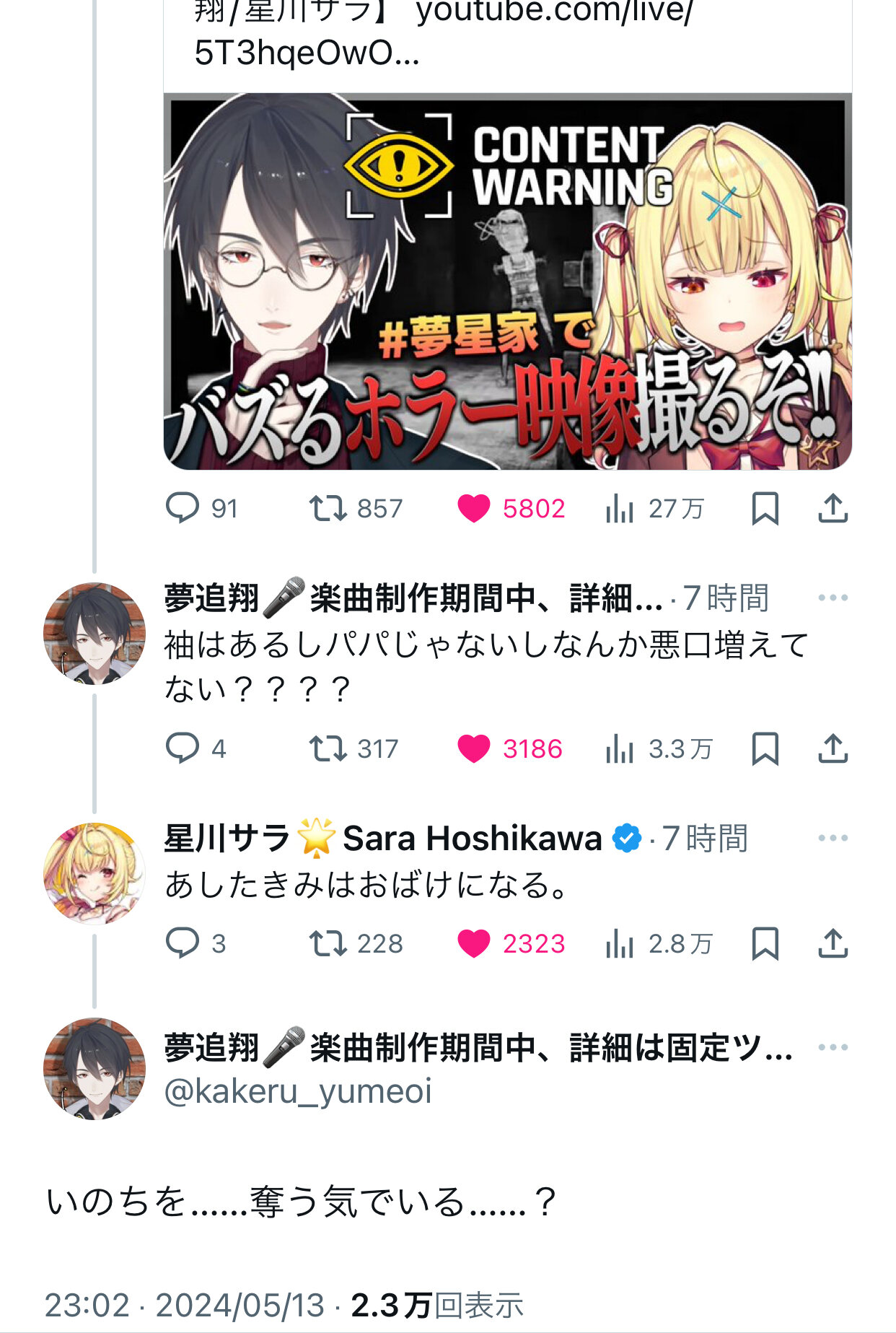 夢星家の話になっちゃうけど昨日のコラボで「俺4んだ方が面白いかな」って言ったり、「4んでるところもかわいいよ!」ってホームビデオ回してるゆめお、最高にゆめおだったな…
