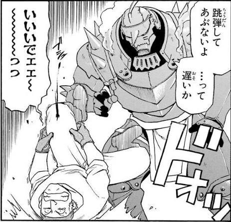ゴリさんとハインケルがエドを人質にした時に追っ手の兵士たちがエドだと気づかないで「こんな小さな子になんてことするんだ!」って泣きながら憤ってたとこ