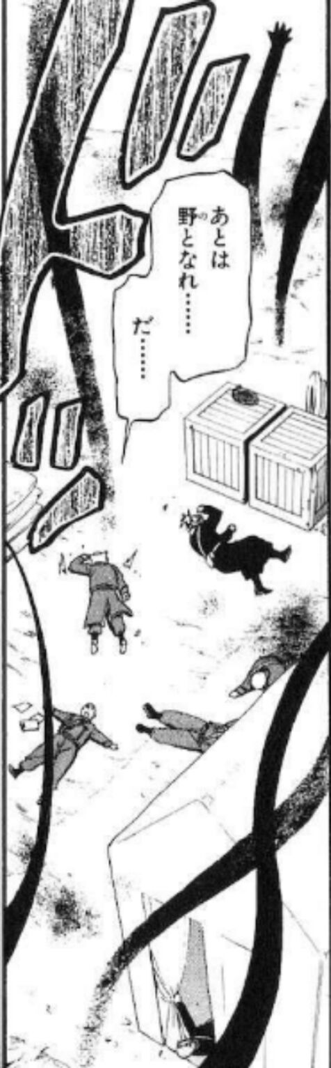 クソ強いのがわかってるからヒューズ殺しの犯人探してる時みんな固唾を飲んで見守ってるんだろうな。でも仮に大総統との面談の時に大総統が「私がやった」って答えたら大佐はどうするつもりだったんだ
