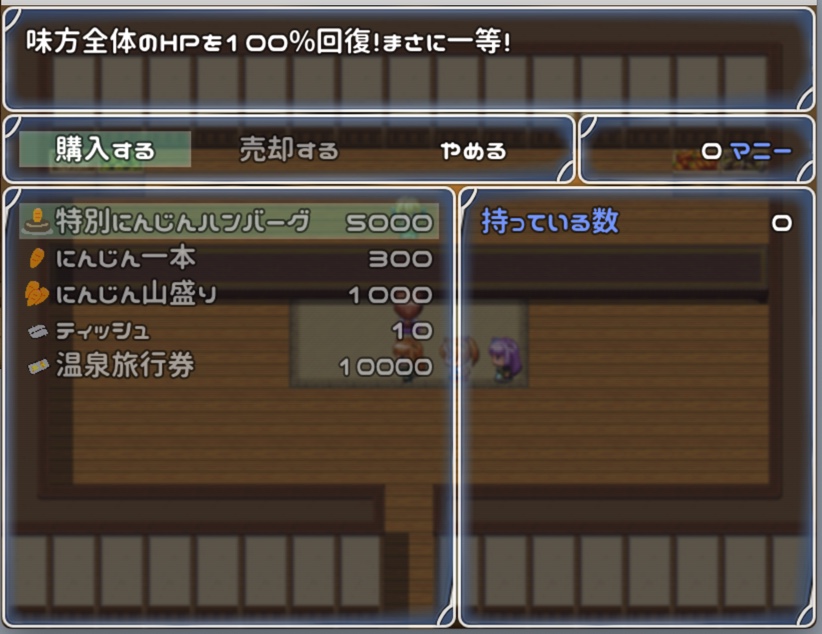 回復アイテムは福引のやつから持ってきたらどうだろう 小回復はにんじん1本、中回復はにんじん山盛り、大回復はにんじんハンバーグとか でもにんじん山盛りは全体回復感あるな