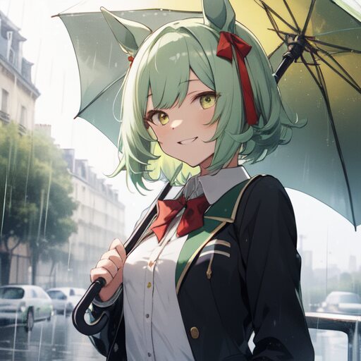 umamusume,medium light green straight hair,light green hair, yellow eyes, girl, Small breasts, Small breasts, Small breasts, yellow eye, horse ears, school uniform, day, park, smile