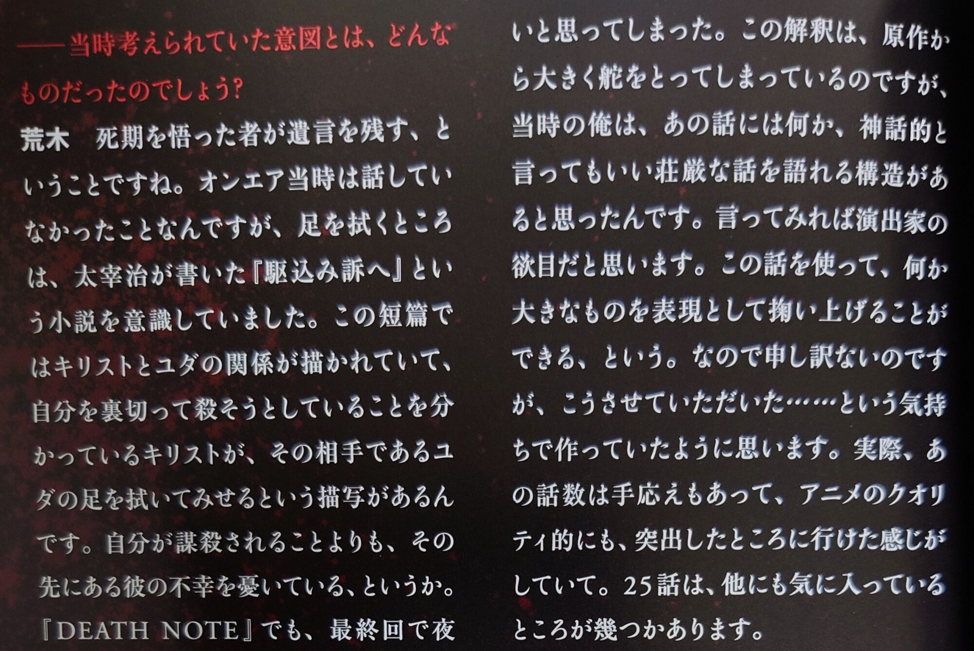 この足拭き前のシーンでLが雨の中で月に向かって「生まれてから一度でも本当の事を言ったことがあるんですか」って言うところ印象深くて今も覚えてるわ