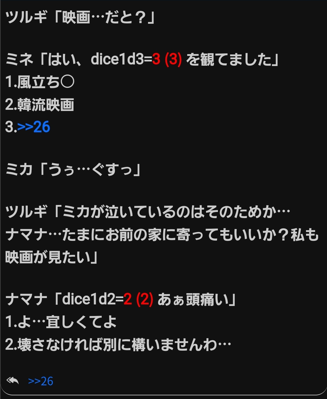 - 177čć¨ăăăâ3MZY4UWjIZXr24/05/25(ĺ) 23:27:15ăăăăă˛ăăăć§âŚďźdice1d3=1 (1) ă 1.ăăćăă§ăăăďź 2.ăăćŻăčăă§ăăăďź ăăă貴弳ăç§ăŽă˘ăă ăŁăŚĺčŞčăăăŚăăăă ăăć§ăŻăă1ăăŤăă2ăăäťăăžăă ă1ădice1d3=1 (1) 1.éŚç 2.čŠ 3.ä¸Ąćš ă2ădice1d3=3 (3) 1.大ăăŞĺăżčˇĄ 2.辤ăč Ťăăç¨ăŽăăščˇĄ 3.ä¸Ąćš