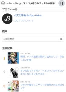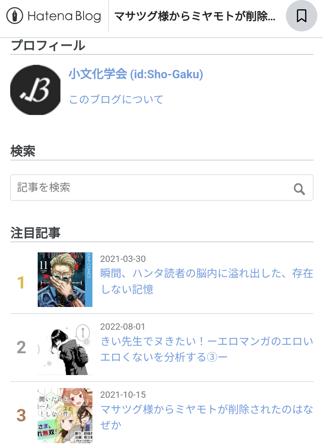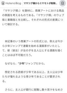 マサツグ様からミヤモトが削除されたのはなぜか - 小文化学会の生活1.はじめに 2.『マサツグ様』の書籍化 2-1.ウェブ版の『マサツグ様』 2-1-1.『マサツグ様』 2-1-2.徹底した俺TUEEEE 2-2.書籍での『マサツグ様』 ①マサツグの過去について ②クラスメイト、ならびにミヤモトの削除について ③ヒロインたちのキャラについて 2-2-1.ストーリー 3.分析 3-1.なろう小説の特殊性 3-2.ラノベの形式 3-2-1.ラノベの作法 4.おわりに 参考文献 1.はじめに 本記事は、なろう小説『異世界で孤児院を開いたけど、なぜか誰一人巣立とうとしない件』(以下、『マサツグ様』)を題材に、商業アートにおける商品の側面を考えるものである。『マサツグ…sho-gaku.hatenablog.jp - 2二次元好きの匿名さん24/05/23(木) 17:46:05