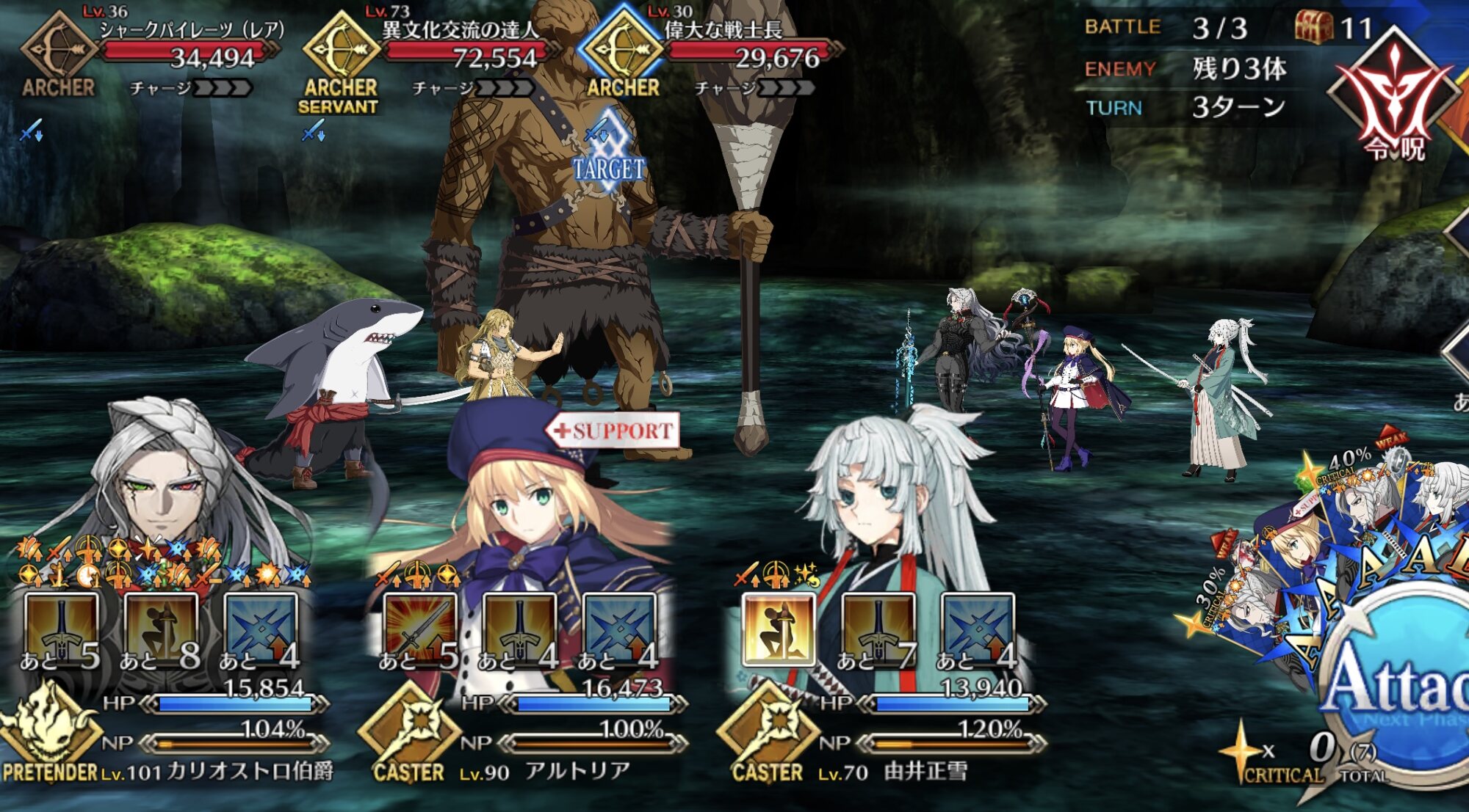 スレ主のお宅の伯爵の場合復刻イベ90++の3waveはマスター礼装決戦制服、凸特攻礼装つけた伯爵にwキャストリア+オベロンでキャストリアの宝具を1回挟めばいけると思うぜ