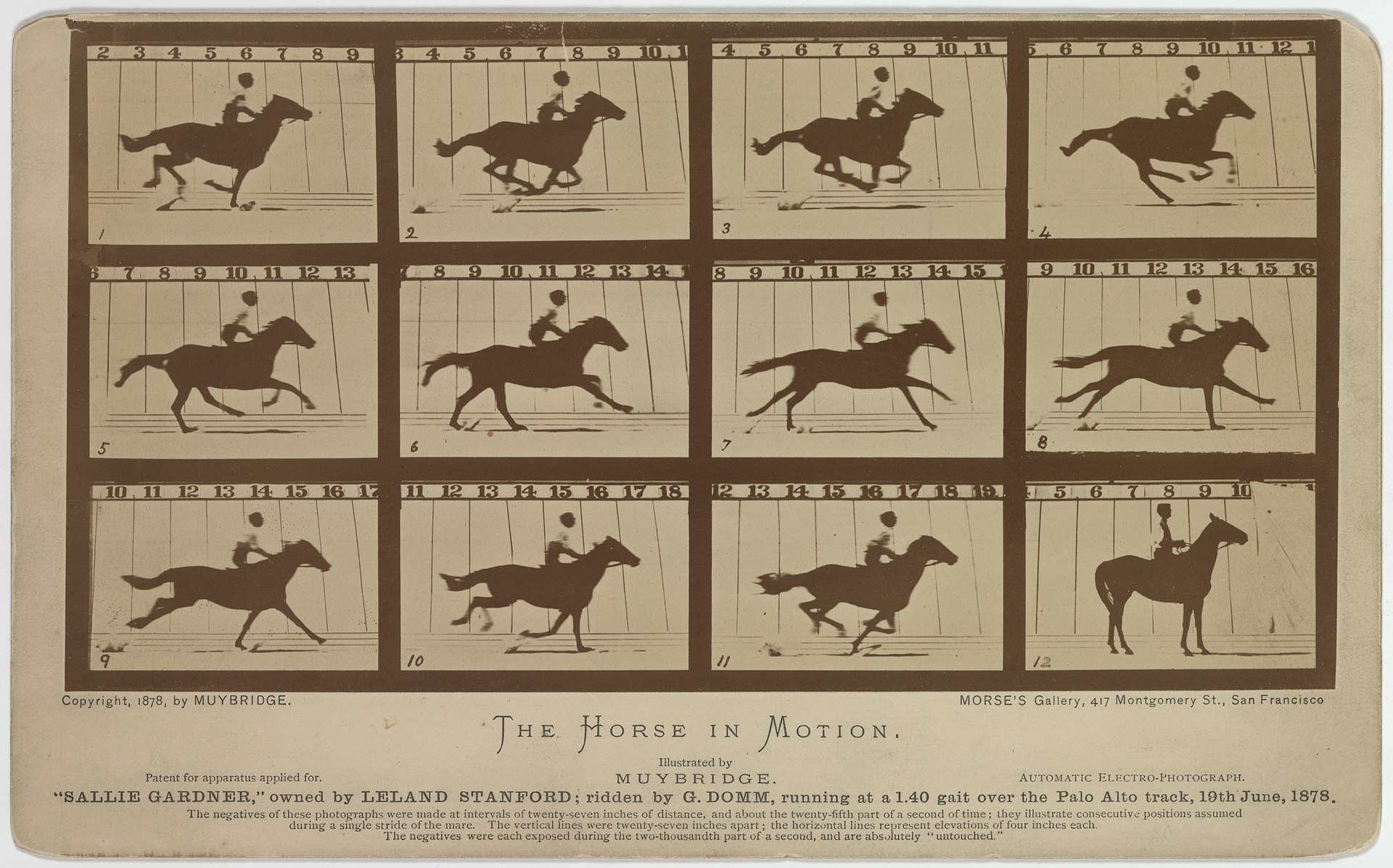 >1880年、マイブリッジはカリフォルニア美術学校での発表の際に、記録した映像をズープラクシスコープ(英語版)を使って動く絵で映し出した[24]。これが世界初の映画上映だった。その後、彼は蓄音機を発明したばかりのトーマス・エジソンと出会った。エジソンはその後、映画用カメラの前身となるキネトスコープを発明した[25]。