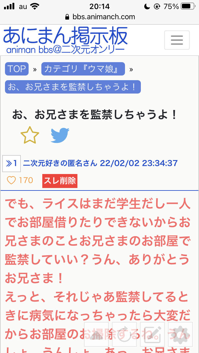 - 158二次元好きの匿名さん22/02/12(土) 18:06:09監禁生活もしっかり元通りに戻ったね。お兄さまもきゅーっときれいな体になったし、ライスも元気だし。それじゃあ今日も監禁、がんばるぞー、おーっ!