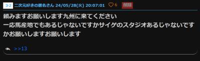 一応馬産地でもあるじゃないですかサイゲのスタジオあるじゃないですかお願いしますお願いします - 3二次元好きの匿名さん24/05/28(火) 20:14:10