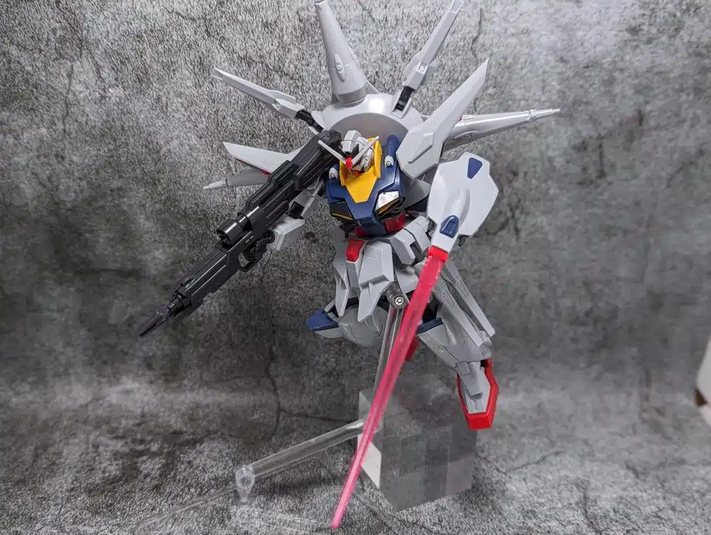 腰レールガンやスタンダードなビームライフルに頭部バルカン・サーベル付き盾と分離しないけどリフターじみた大型バックパックと