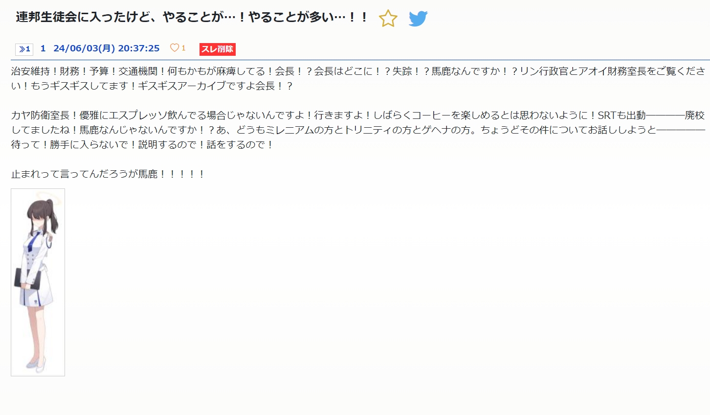 あ、カンナ局長!お疲れ様です!はい、アビドス高等学校の皆さんは凄く強いですからすぐに終わるかと!ふふふ、大丈夫ですよ、カンナ局長!今回は連邦生徒会の権限を使ってるのでヴァルキューレが何か責任追及されることはありませんので!え?そうじゃない?私の豹変ぶりが酷かった?言い方酷くありませんか!?私はただ、今まで会ってきた人達を真似ただけですよ!?カヤ防衛室長、アオイ財務室長、リン行政官、ナギサさんを混ぜたらあんな感じになりますって!ちょっと!笑わないでください!ほら!そろそろお仕事ですよ!夜勤手当は出しますから頑張ってくださいね!私はこれからの事後処理に頭を悩ませますので! - 107◆0GogSnd0s224/06/05(水) 22:18:37