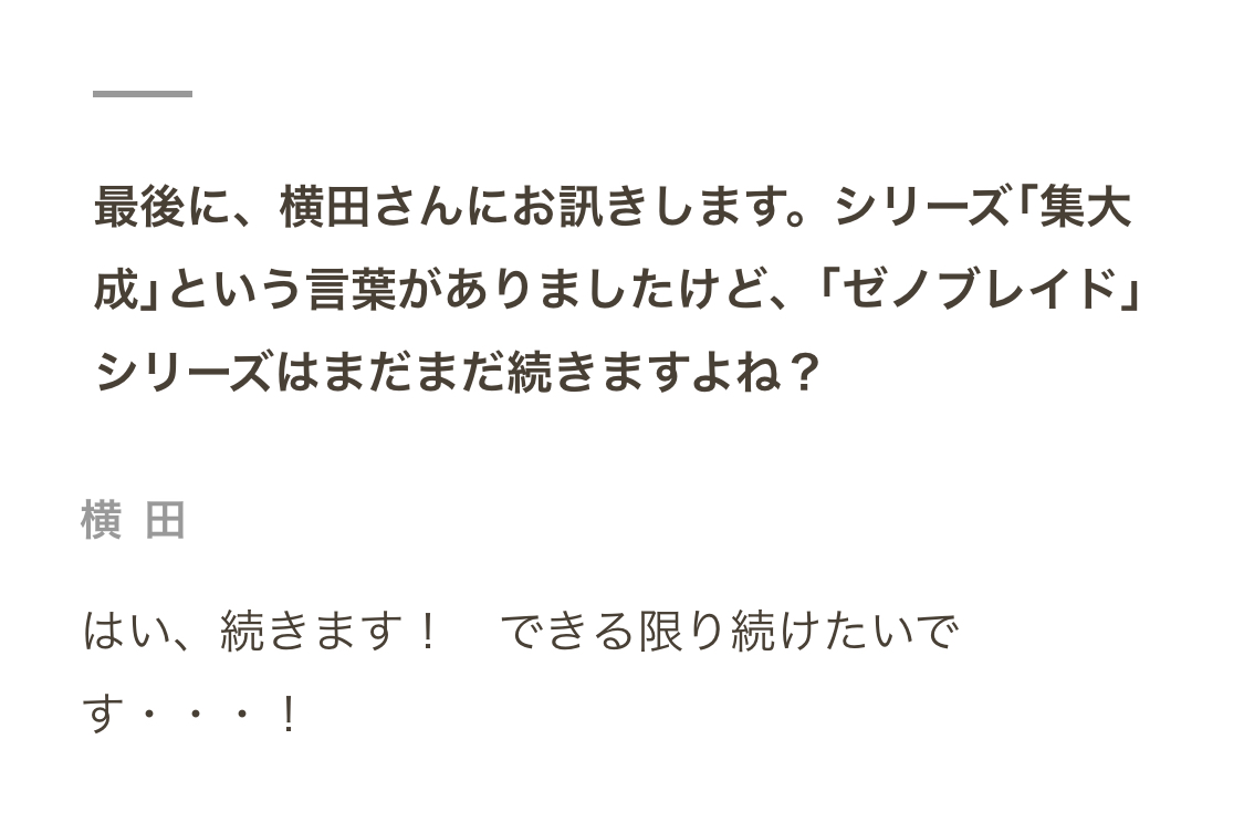 でも、それをやるとなると、「ゼノブレイド3」のさらに先を作らなきゃいけなくなるので。