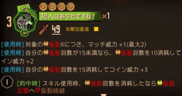 ・この効果でスキル1を使用するとき、コイン効果で自分が得る振動回数が増加し、該当スキルの最終コイン的中時に心臓爆発
