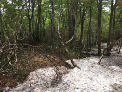 残雪期の雪山から下山中
