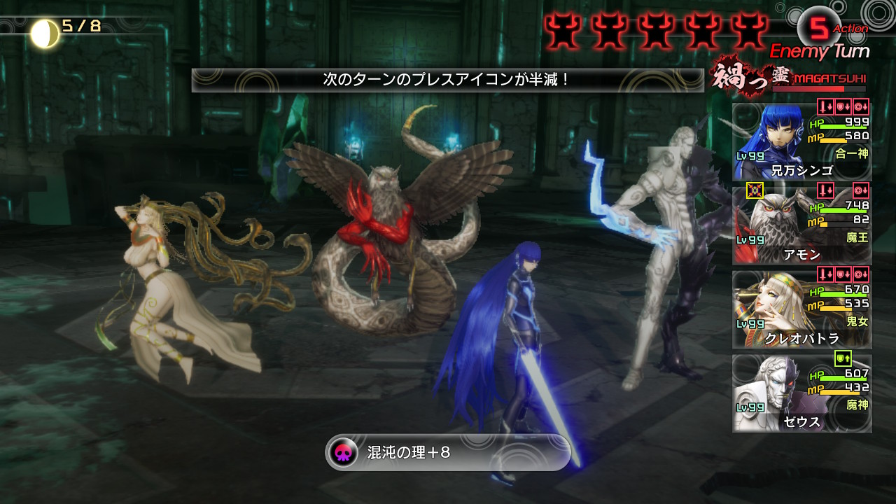 ジャアクフロスト、アマノザコを出します。そしてオーディンとデメテル交代してマガツで削ります。もう回復してこないと思うからこれでいきます。ただ混沌がぶり返しになるのがくっそしんどい