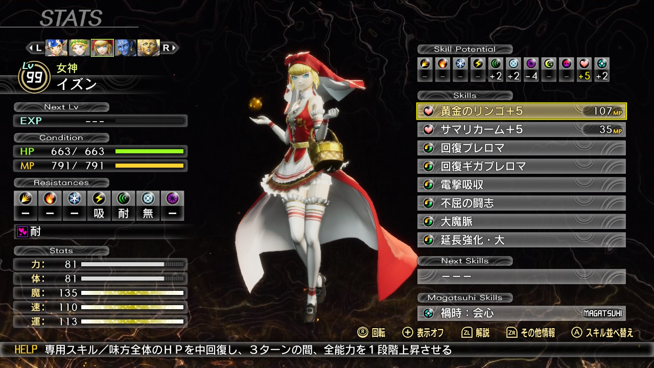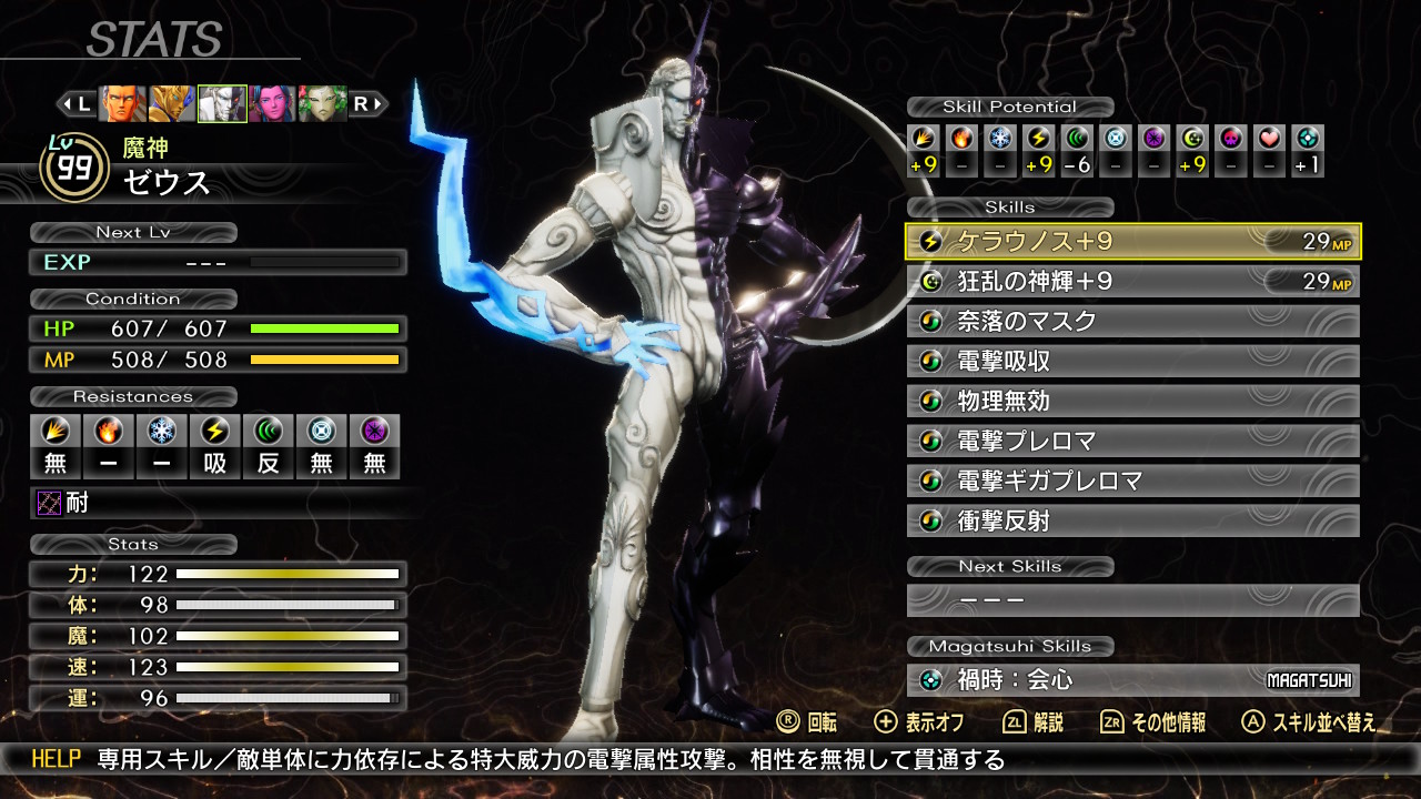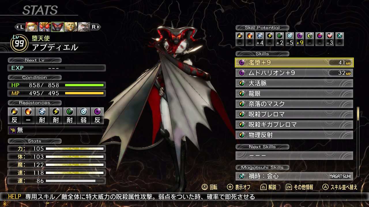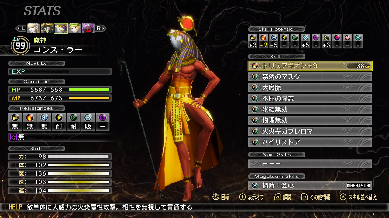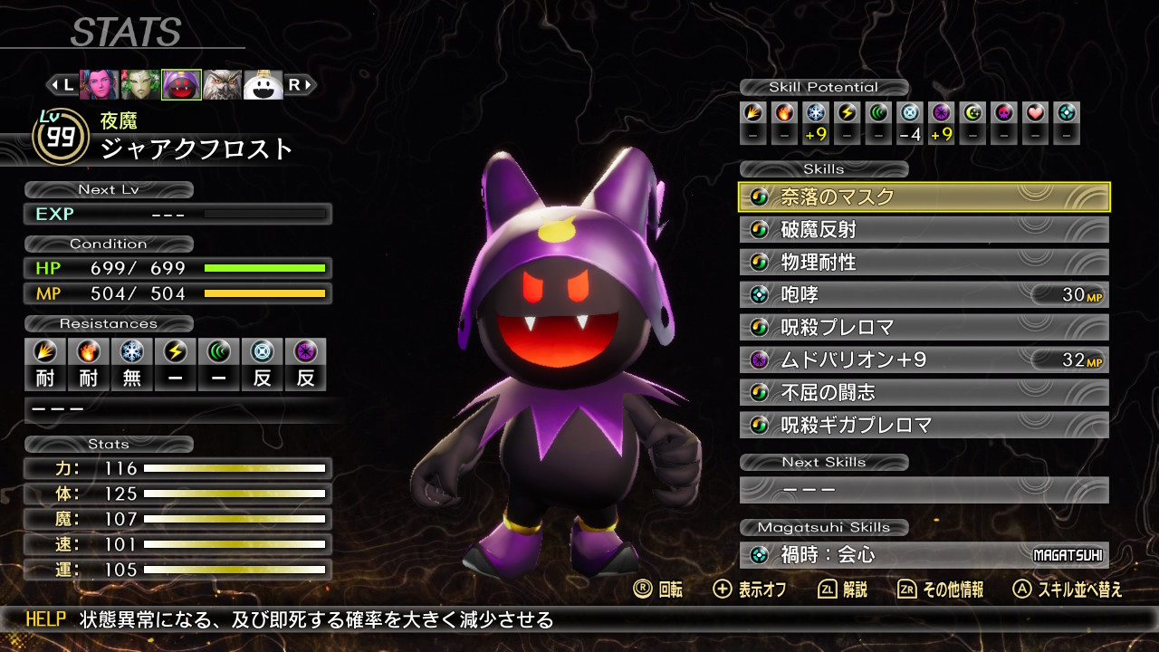 ナルカミで削りながら弱体をデクンダで解除するサブアタッカーなナホビノになりました。ここまで来るのは長かったです。自分は魔速運型のナホビノですが、周りの方のナホビノ見てたら力主体の子ばかりだったので、一時期新生して作り直した方が良かったかなと悩んだことがあります。でもHard人修羅挑もうと考えると転生のままお香で能力値あげた方が勝てる確率上がるかなと踏みとどまりました。ですが、結局人修羅Hardに完敗。でも、このナホビノで真ルートまで迎えられて良かったです。最初に作ったナホビノですから愛着ある。