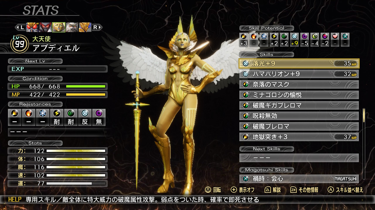 最初はナホビノ兄万シンゴ。ステータスがやっと金色に染まりました。写せ身は察してると思いますが、人修羅の防御耐性を使ってます。ほんと強いなこれ。転生4度もやってるせいかゲームバランス崩壊しますね。