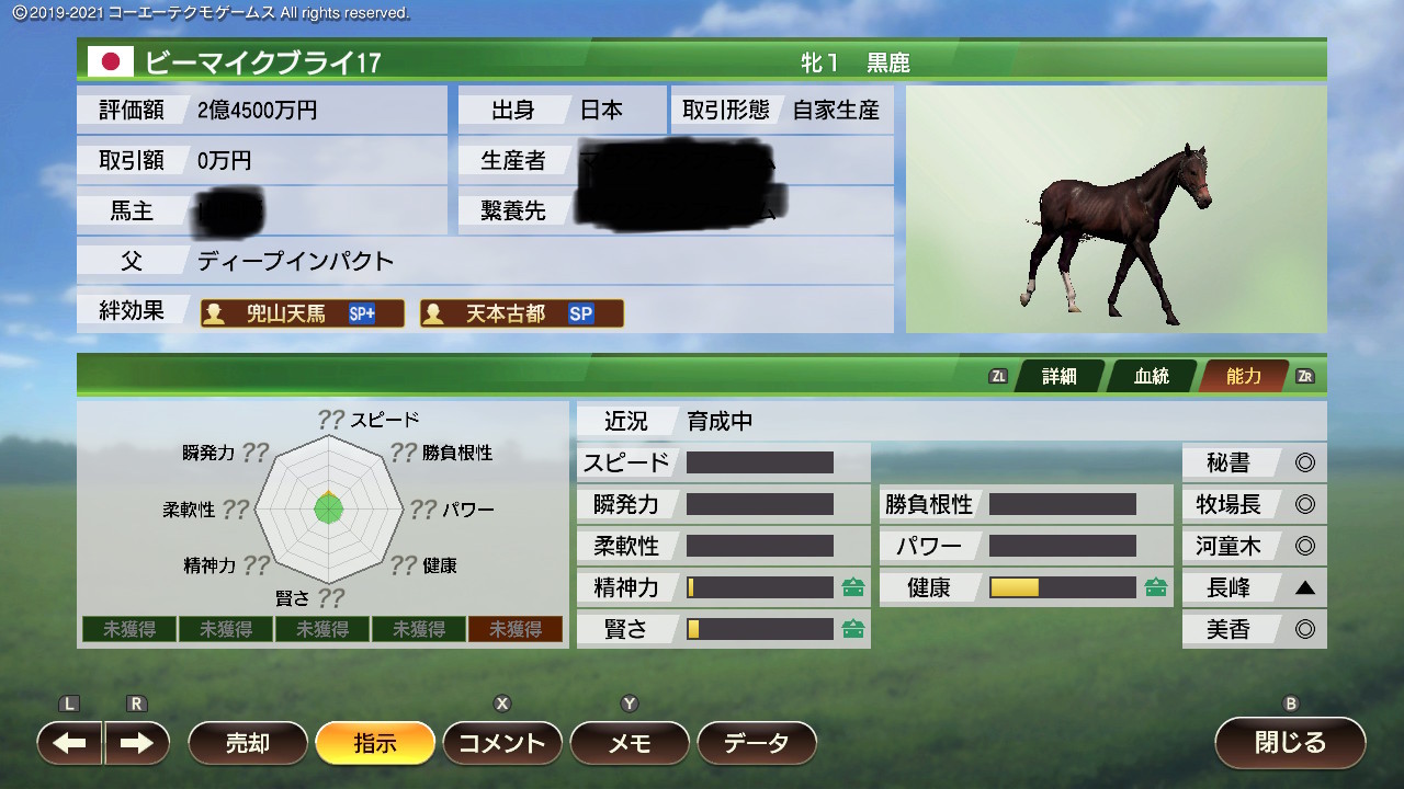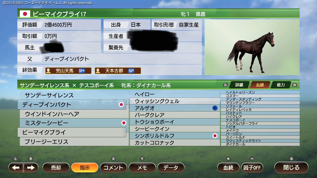 シーザリオのウイポ史実産駒は4頭中3頭が牡馬だけど、娘さんがオーソリティを産んでる以上孫の代まで血が繋がってるから多少安心もん。