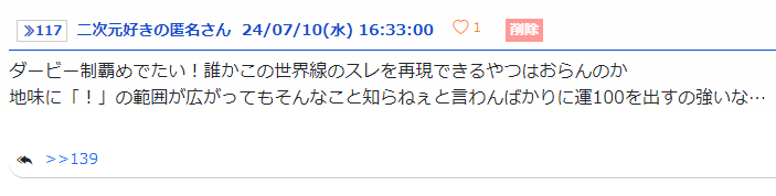 ダービー制覇めでたい!誰かこの世界線のスレを再現できるやつはおらんのか