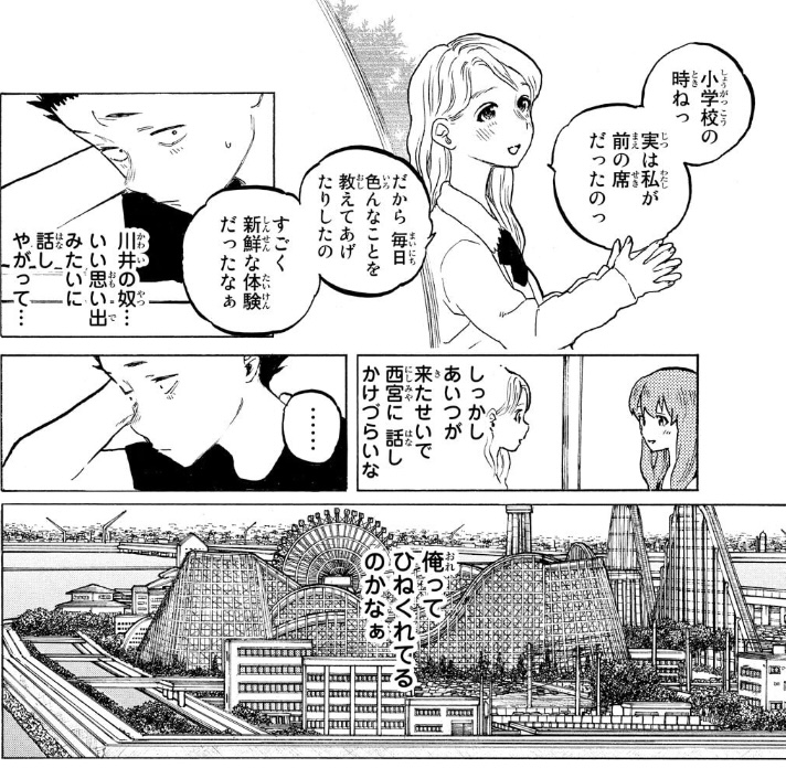 あん時に西宮が怖がって逃げて結絃の近くまで行ったから2巻のゴタゴタがあったわけだから割と川井が怖がって石田の過去の所業をバラしたのと同じぐらいクソボケ行動なんだ!あまり言及しない方がいい!