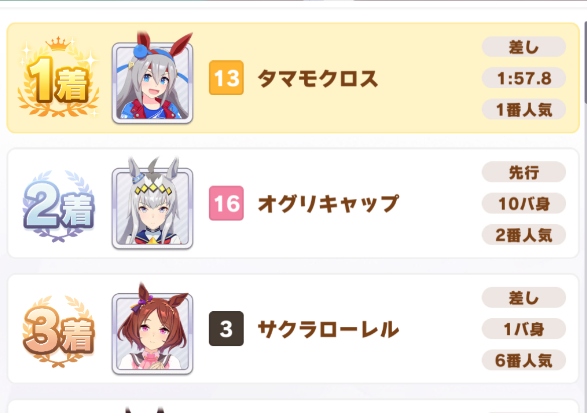 担当の4バ身後ろでオグリチヨノオーヤエノ.etcとシングレ組が6着ぐらいまで団子だったときはなんか名勝負を潰してしまった気持ちになった