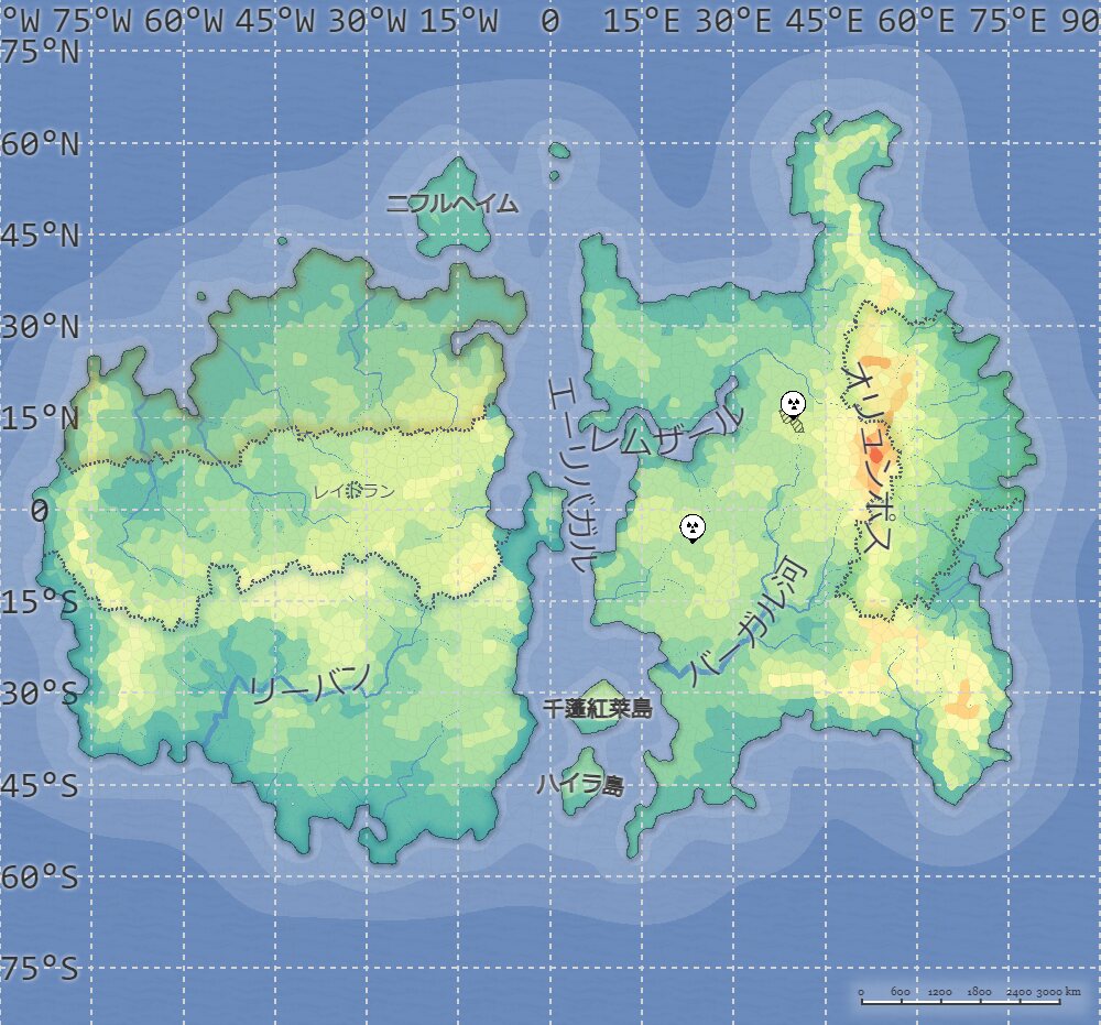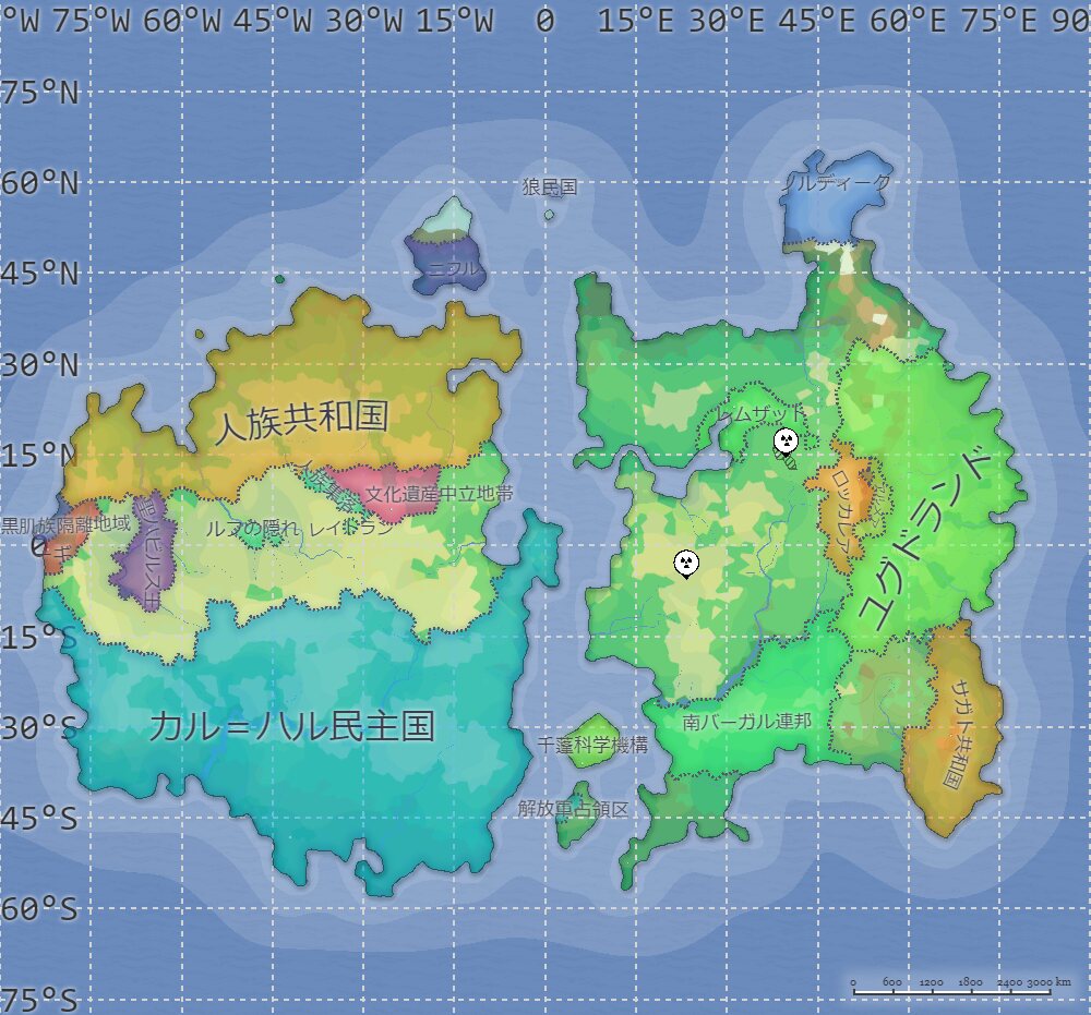 - 932124/07/13(土) 21:11:26名称:レムザット商王国 説明:漁業によって栄えたレムザール湾を中心に建国された新興国。漁業のみではなく、貿易拠点の一つとしても発展している。 ヨルド大陸との貿易も行われており、人族共和国出身者が何人か国家の上層部に食い込んでおり、獣人とエルフの輸出拠点となっているという噂も。 名称:エーギル首長国 説明:膨大な石油と核物質が採取されようとしている 頭に白いターバンを巻く 名称:ニフルの民と氷山の国 説明:ハビルス王国に嫌気がさし、ある獣人の一族から手に入れた薬を飲んで寒冷地耐性を手に入れて逃げ込んだ一族の住まう国 名称:ノルディーク王国 説明:北方を中世から治める一族の国 昔は海賊として周辺を荒らしまわったが現代では他国とも友好的である 名称:南バーガル樹海諸民族連邦 説明:南バーガル樹海を領土とする連邦制国家 世界樹根諸国でも随一の混血が進んでいる国であり、家族間で種族が違うことはもはや当たり前のものとなっている 名称:ハイラ解放軍占領区 説明:ハイラ島を解放するという名目でカルハルハが軍事支援してる地域 占領区では恐怖政治を敷き、他勢力圏の抵抗を強め、抗争が泥沼化している 名称:黒肌族隔離地域 説明:人族共和国とカル・ハルハ民主国が人間の一種である「黒肌族」を隔離するために設立した自治地域 あるのは自治権だけで外交権は認められておらず、住民も"人間"とは扱われていない