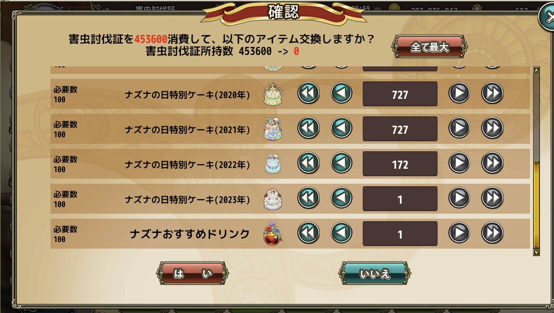 重い腰を上げて2ndアニバーサリーより前から放置してたイベント報酬装備約1000個を2時間半かけてカンストさせた