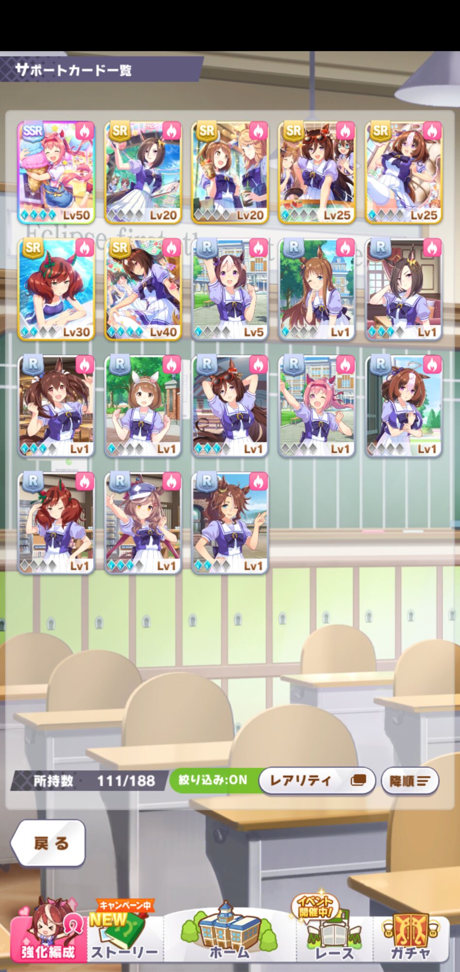 キャラガチャ全ブッパで配布以外SRすら1凸してないだったのが悪いんだろうなぁって思って最近はサポカ集めを頑張っている