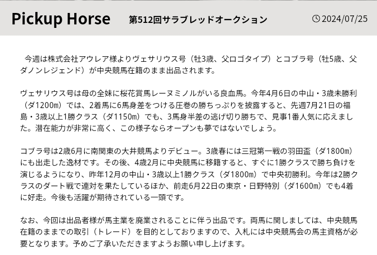 中央の現役馬がオークションに出品される