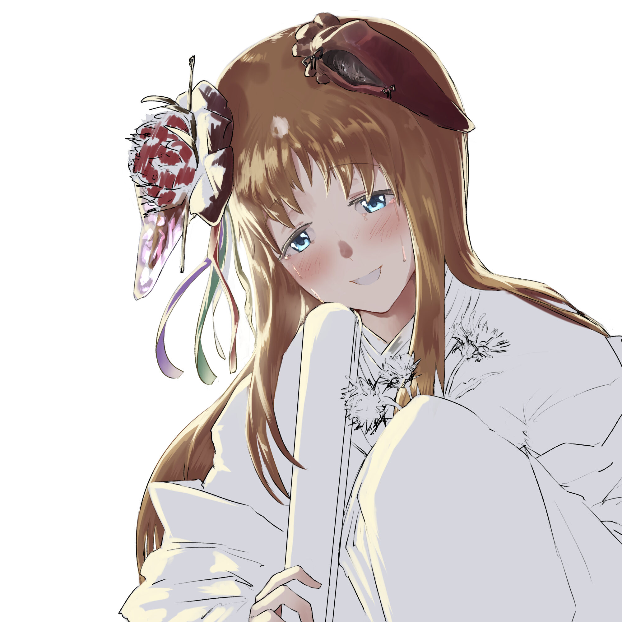 髪飾りの花は、水彩ペンのサイズ大きくして、グリグリと5個の〇重ねてから、消しゴム(描画色・透明でもいい)でおしべめしべを描いたよ