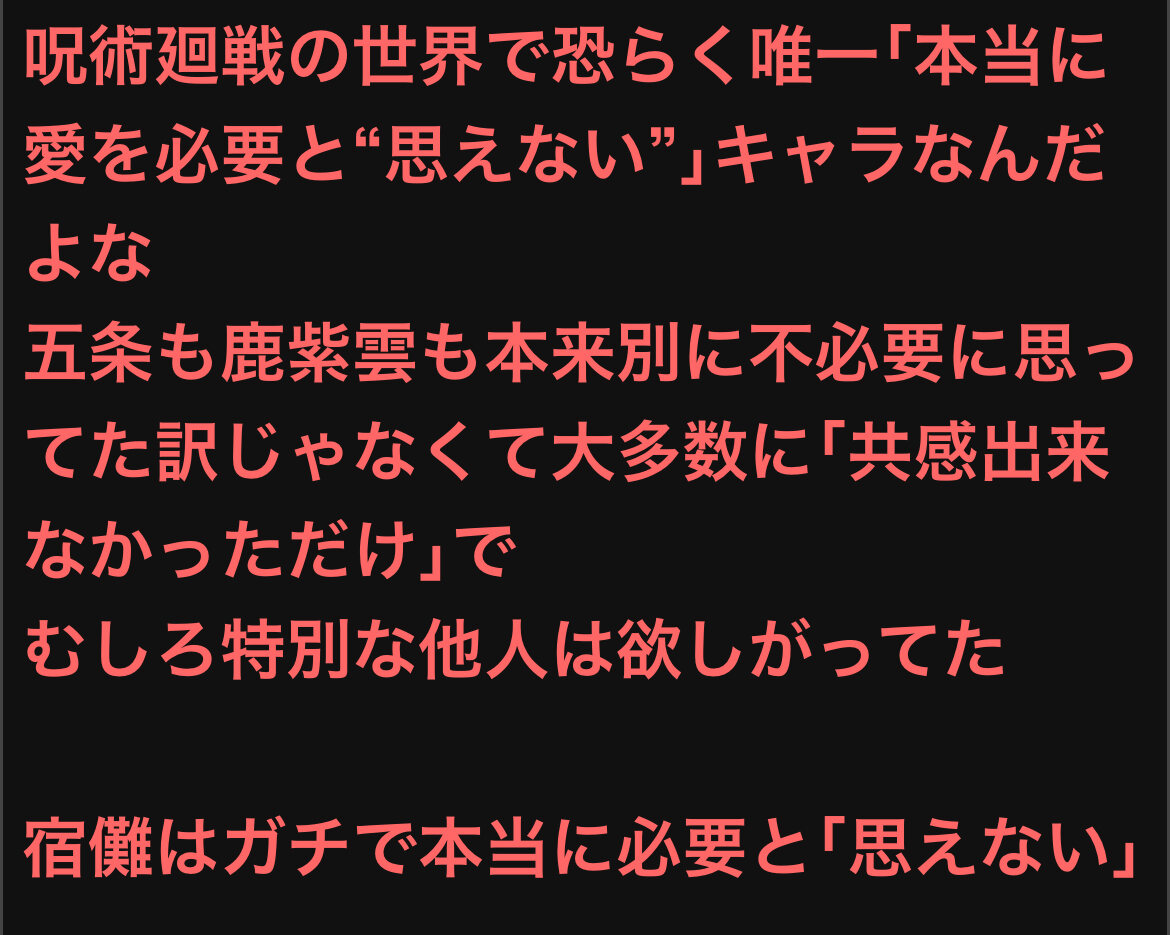 宿儺はまさに強いだけで愛されたしそれに応えて生きてきた存在だと思うんだよね