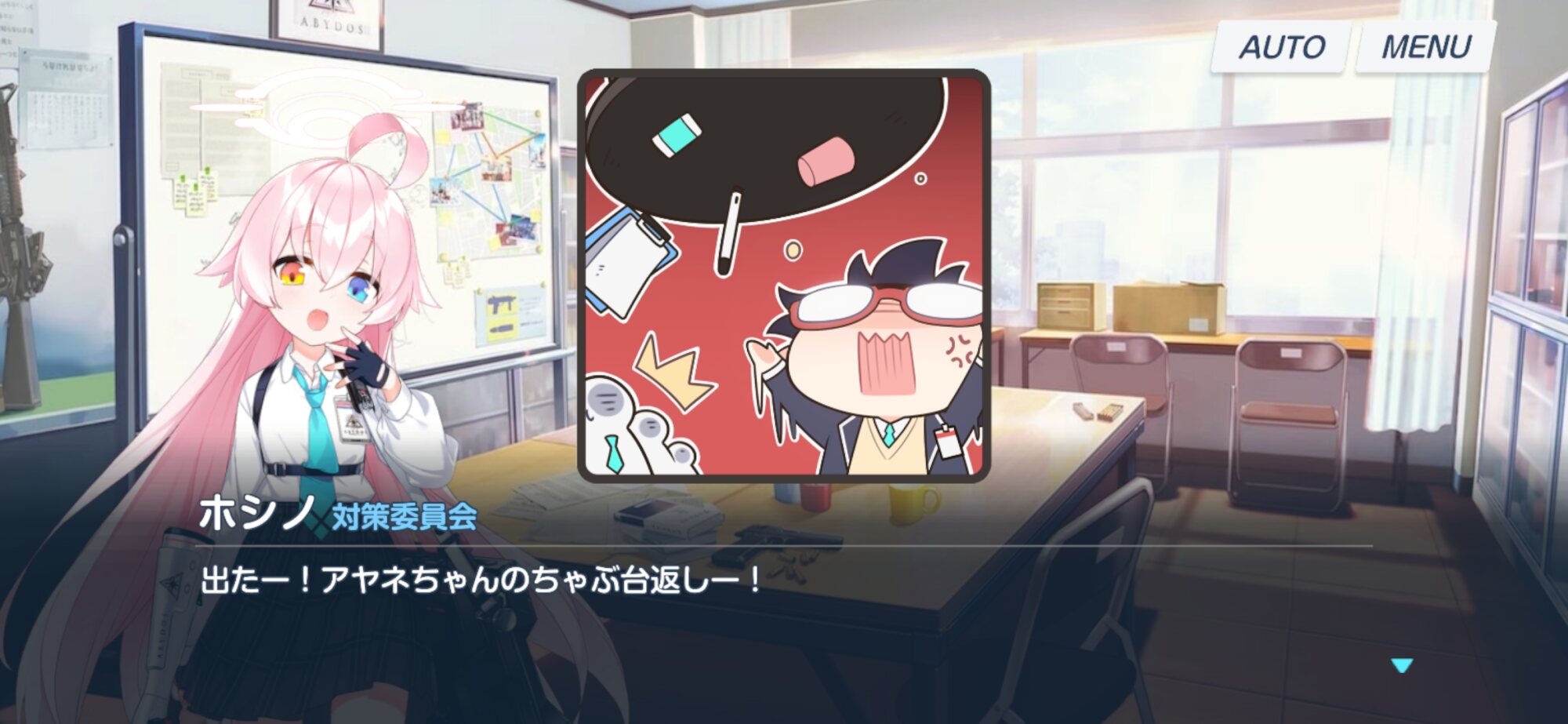 ん、ホシノの机を前後逆にする。きっとこまる。