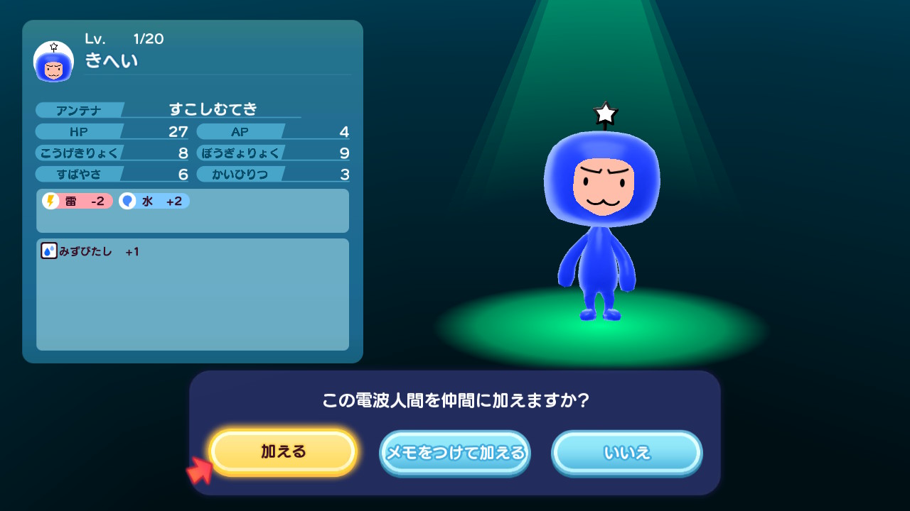 とりあえずキャッチする時はデカめの電波人間を捕まえるといいのん ちなみにステータスのHP、攻撃、防御が高くてすばやさと回避率が低い子が大きめらしいよ
