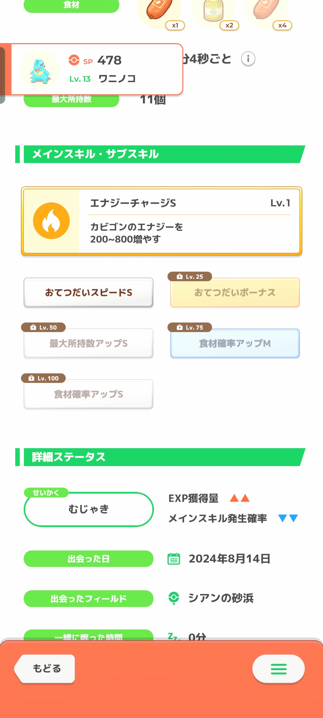 特にレベル40超えたあたりからきのみエナジーもガンガン伸びていくし、食材そんなたくさん持ってこられても全部使えるわけでも無いし割とマジで不思議なんだよな