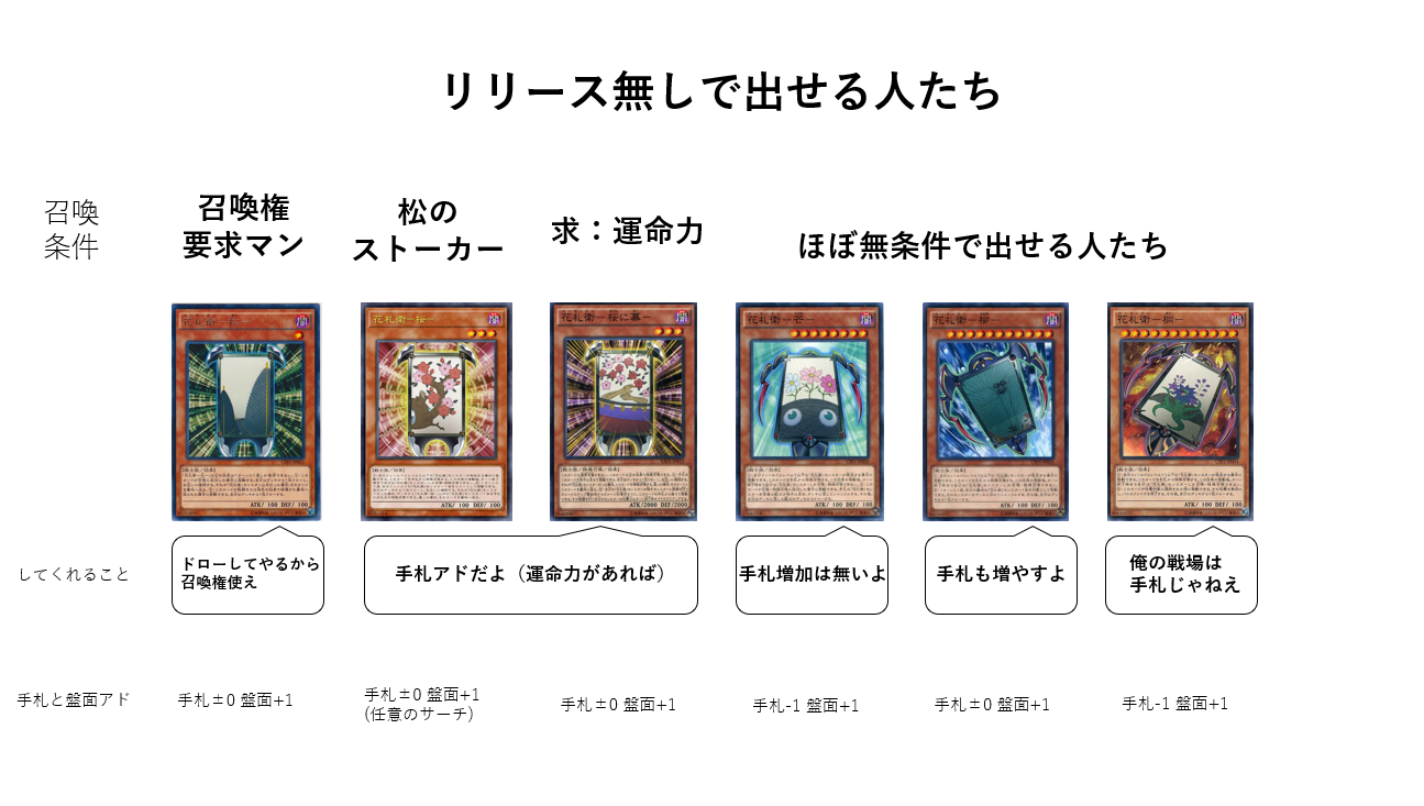 花札衛の基本コンセプトは、『条件を満たしたときに特殊召喚でき、召喚時の効果でドローするモンスター』と『強力な効果とステータスを持ったシンクロモンスター』の二つ。
