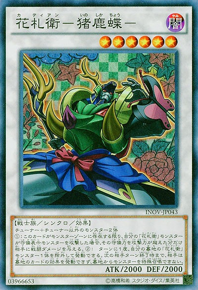 《猪鹿蝶》は立っていると防御貫通効果があるのですが、個人的にはすぐ墓地送りにしたり《超勝負!》の種にしたりで盤面から消した方が良いと思います。ステータスがそれなりっていうのもあるけど、《猪鹿蝶》の分からん殺し性能を最大限に生かすために効果を見えないよう隠しておいた方が良いというのがある。