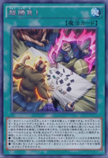 伝え忘れたというか半分普通に忘れていたのですが、《超勝負!》はドロー効果で墓地に落ちた場合エンドフェイズに墓地から魔法を一枚手札に加える効果があります。普通に強いです。死者蘇生の上位互換みたいなことやってる《札再生》やドローとデッキ再生を両立できる《貪欲な壺》、勿論《超勝負!》自身も持ってこれます。この効果は墓地に落ちた《超勝負!》を持ってこない限りターン毎に使えます。