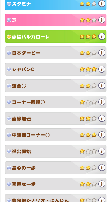 あと豊食祭の仕様で料理大成功時にサポカからヒントを貰えるんだけど、貰えるスキルを全てMAXにすると適正に合った脚質(距離かも?)スキルのヒントを貰えるから白スキル0が逆にメリットに成っている(とは言っても目当てのスキル何てなかなか来ないが)