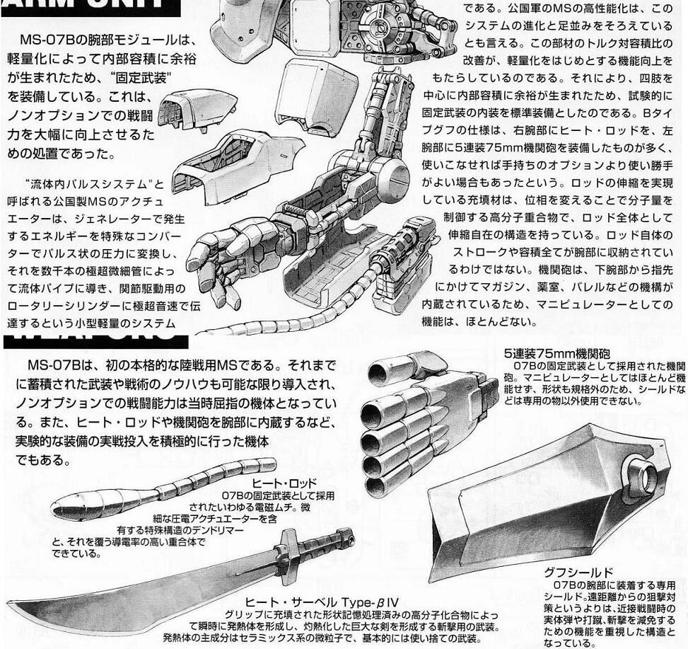 『機関砲は、下腕部から指先にかけてマガジン、薬室、バレルなどの機構が内蔵されているため、マニュピレータとしての機能はほとんど無い』伝Gガンタフ