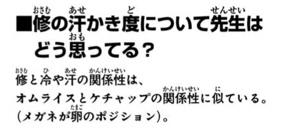 しかし、実際ほかのキャラクターと比較したらどうなのか。修くらい冷や汗を掻いているキャラクターはいるのではないか?そう考えました。 - 5◆y8wdfGV1nTPH24/09/29(日) 16:01:27