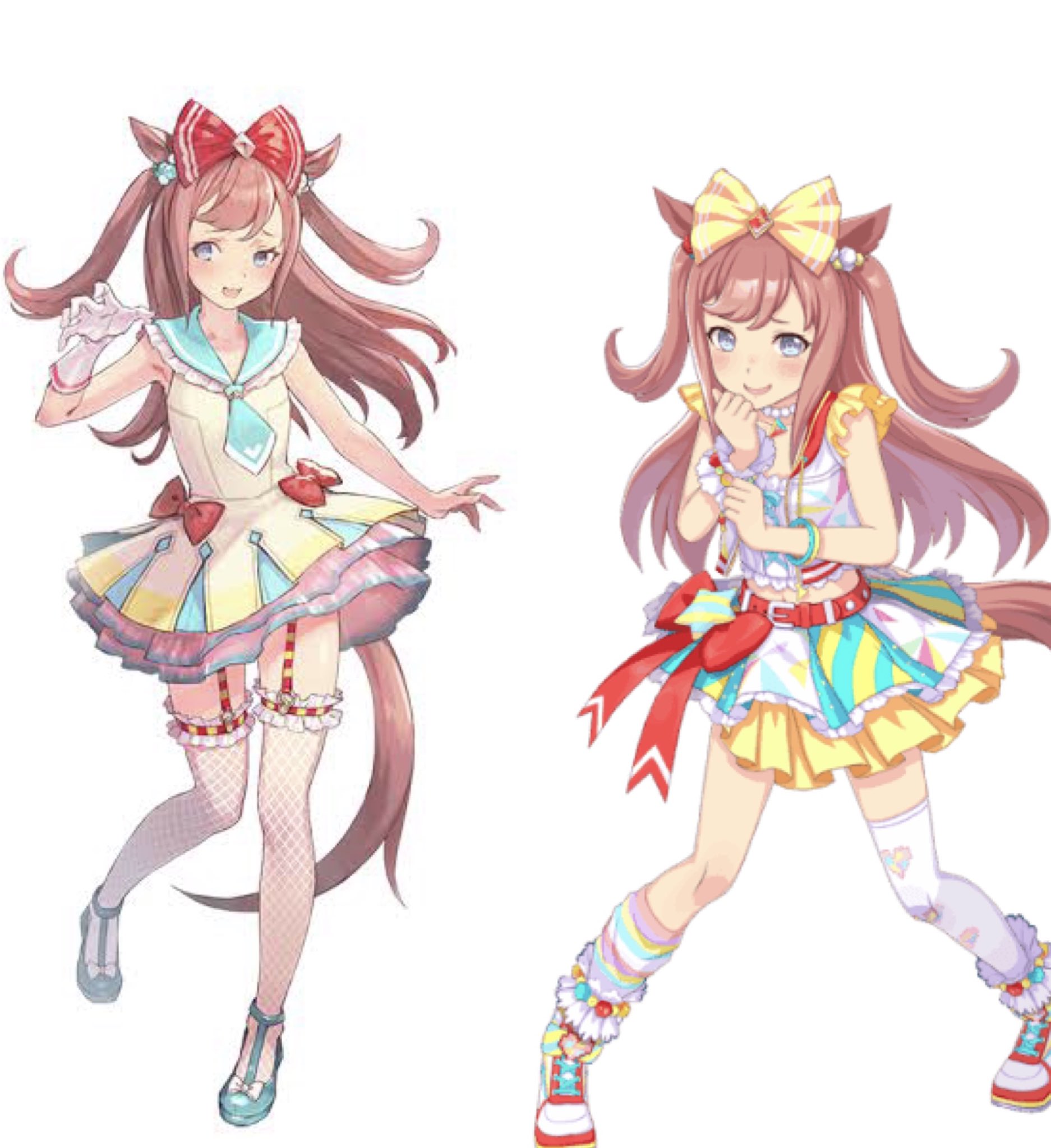まず、実馬の体格が細くて小さくて450kgくらいなので美少女擬人化する時にはロリキャラにされ、アメリカ生まれだから洋物ロリとなり、元々の勝負服がカラフルだからそれをロリに似合うようにパステルカラー系でデザインしたらガーリーで可愛い系のファッションになり、カラフルパステルカラーのロリファッションに合わせて髪の色もピンクにしてみたり、クソデカリボンを付けてツインテールを追加したりして、勝負服と全体の色のバランスを取れるようにデザイン修正していくと、何故か幼女っぽくなるんだよ